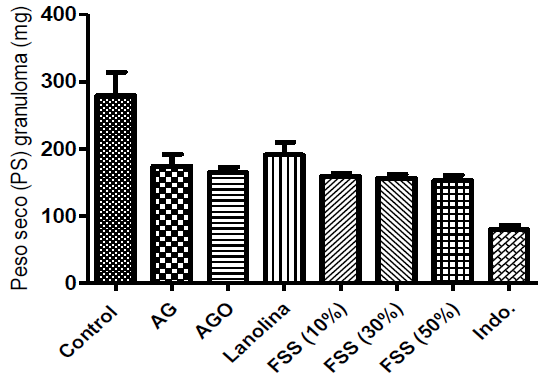 Los resultados del efecto de las aplicaciones tópicas de los tratamientos de las sustancias en ensayo (AGO y FSS (10, 30 y 50 % de AGO) sobre los parámetros de peso húmedo (PH) y PS en el modelo del granuloma inducido por algodón en ratas. El grupo control mostró una marcada respuesta inflamatoria determinada por el incremento tanto del PH como del PS del pellet de algodón, partiendo de un peso inicial de 50 mg. (tabla 1).