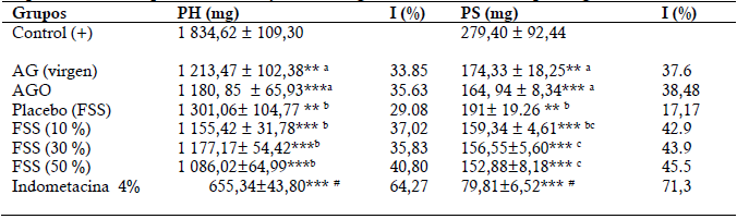 La aplicación tópica durante seis días del AGO redujo de forma significativa y moderada tanto el PH (35,63 %) como el PS (38,48 %) del granuloma, comparado con el grupo control. De manera similar, las FSS de AGO (10, 30 y 50 %) inhibieron de forma significativa y moderada, el PH (37,02; 35,83 y 40,80 %, respectivamente) y el PS (42,9; 43,9 y 45, 5%, respectivamente), del granuloma en comparación con el grupo control, siguiendo este último parámetro de PS, una respuesta dependiente de la dosis para p < 0,05. El grupo de animales que recibió tratamiento con la crema de indometacina 4 %, experimentó una reducción significativa y marcada tanto del PH como del PS (64, 27 y 71,3 %, respectivamente) del granuloma inducido por algodón, en comparación con el grupo de animales control y al resto de los grupos estudiados (tabla 1).