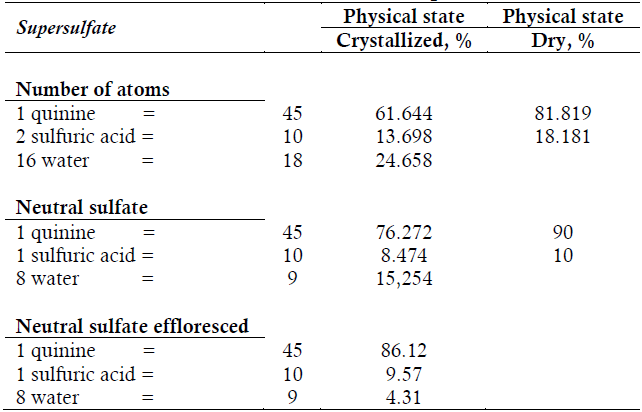 Baup determined the amount of water of crystallization present in cinchona sulfate by heating it in a stove at 120 °C until no further diminution of weight took place (4.67% of the neutral crystalline sulfate). The content of sulfuric acid was determined by precipitation with barium chloride from a solution of the sulfate in diluted acetic acid (added to facilitate dissolution), and the cinchona by the deficiency. These results indicated that the "atomic mass" of cinchona was 38.689 (again assuming oxygen =1), not so different from the value 38.488 reported by Pelletier and Caventou, and corresponding to the compositions (Baup, 1824):