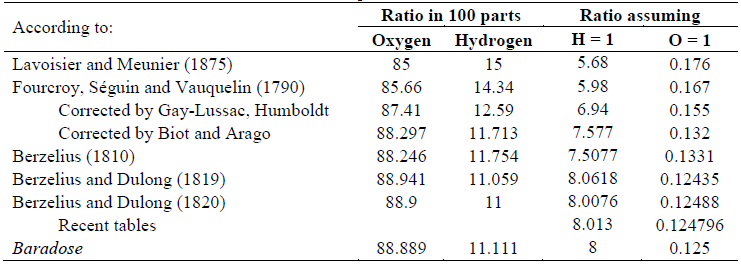 Baup decided not to occupy himself with the atomic theory but with the number of equivalents or proportional weights by which the bodies combined between them. His basic assumption was that in the neutral salt of the simplest electropositive and electronegative elements, these were combined in the ratio of one equivalent, barodose (or dose), which was definitely and irrevocable fixed. In his first application, he considered the barodose of oxygen, hydrogen, and water. The proper calculations will be shown in detail to illustrate the procedure followed by Baup (Baup, 1842):