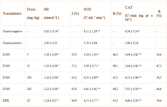 Por su parte, la DEX, sustancia de referencia, redujo significativamente las concentraciones de grupos SH a la vez que restituyó significativamente la actividad enzimática de la SOD y la CAT respecto a los animales del grupo control positivo.