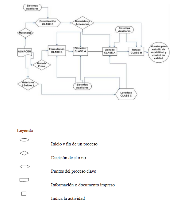 El mapa del proceso, como diagrama detallado resultó útil como ayuda para el análisis de los puntos críticos en cada una de las etapas identificadas. El mismo aseguró que las etapas no fueron olvidadas o ignoradas para la determinación de los riesgos potenciales en cada una de ellas. Se definió que en el área de formulación de la planta de producción se prepara según la formulación evaluada en los lotes a escala de laboratorio, esta es filtrada en el área contigua, después de la filtración se procede al llenado y retape de los bulbos. Una vez culminada esta etapa, se trasladan las muestras a la UDI para realizar el control de calidad en tiempo cero y el estudio de estabilidad vida estante y acelerado, para determinar el tiempo de vida útil del producto.