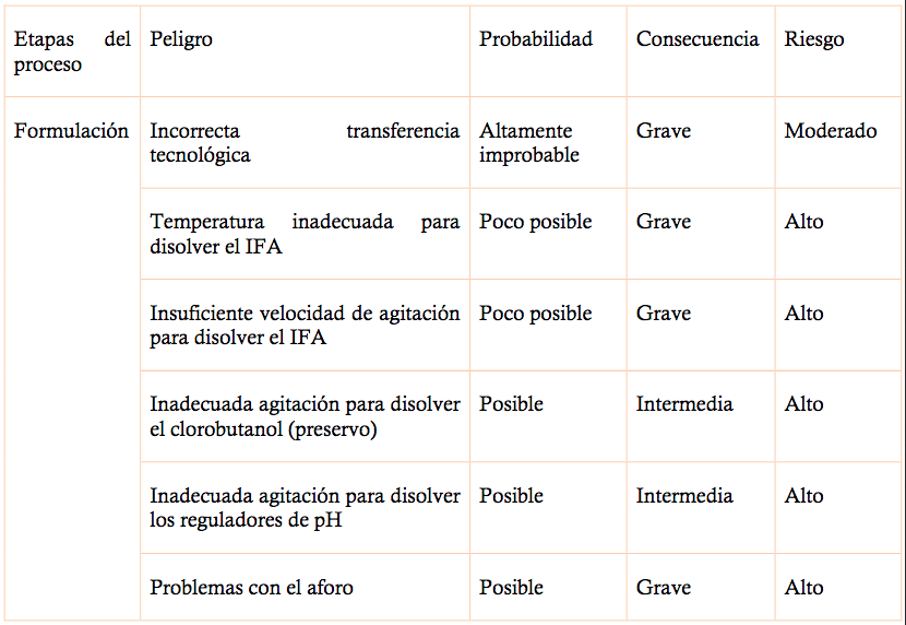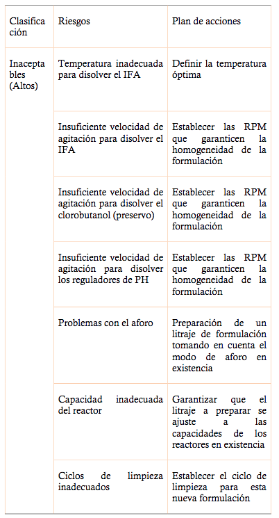 Al evaluar los resultados de la tabla 5 se pudo identificar 9 fuentes de fallas potenciales en formulación, 2 en filtración y 3 en el llenado aséptico. Se debe señalar, que para realizar la apreciación de los riesgos fue necesario requerir un enfoque multidisciplinario dado que los riesgos pueden cubrir una amplia gama de causas y consecuencias. El análisis basado en riesgos implicó desarrollar una comprensión de los mismos, proporcionar elementos de entrada para la apreciación de los riesgos y la toma de decisiones acerca de si es necesario tratar los riesgos, así como las estrategias y los métodos de tratamientos de riesgos más apropiados a seguir. Al quedar definidas en formulación numerosas fallas potenciales, constituye una alerta para el desarrollo de este producto, por ser esta una etapa importante dentro de un proceso productivo. Para el diseño de formulaciones farmacéuticas se requiere de conocimientos y pericia en la aplicación de los principios físicos, químicos y biológicos; por parte del personal que lo precise. Estos conocimientos y experiencias son requeridos para tomar decisiones importantes en la selección del vehículo, adición de excipientes y utilización del envase o contenedor adecuado para el producto final obtenido, así como el proceso de elaboración del mismo (Hussong, 2010).