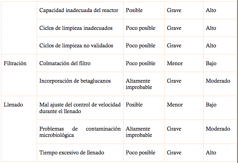 Los factores identificados en el árbol fueron sucesos que estaban asociados con fallos de componentes, como es la capacidad inadecuada del reactor, problemas de agitación (problemas con el agitador) para disolver los reguladores de pH, el IFA y el clorobutanol (preservo), problemas con el aforo; con errores humanos como la incorrecta transferencia tecnológica, ciclos de limpieza inadecuados y no validados, mal ajuste del control de velocidad durante el llenado y con cualquier otro suceso pertinente que conduce al suceso no deseado como la colmatación del filtro, incorporación de betaglucanos, problemas de contaminación microbiológica y tiempo excesivo de llenado.