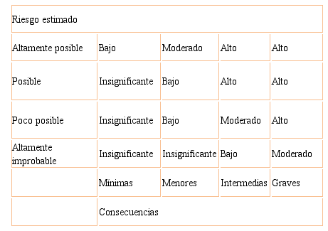 La tabla 5 muestra la estructura seguida para el análisis de la evaluación de riesgo estimado a través de una matriz de riesgo, (método cualitativo) donde se tuvo en cuenta los factores de probabilidad de ocurrencia y parámetros de consecuencias. El método cualitativo se encuentra descrito dentro de los métodos que se utilizan en el análisis de riesgo, también pueden ser semicuantitativo o cuantitativo. En este trabajo se seleccionó la apreciación cualitativa, se definió desde los inicios las consecuencias, la probabilidad y el nivel de riesgo indicando niveles de "Insignificante", "Bajo", "Moderado" y "Alto". Es necesario reconocer que todos los niveles de riesgos propuestos fueron estimativos (Wackerling, 2016).