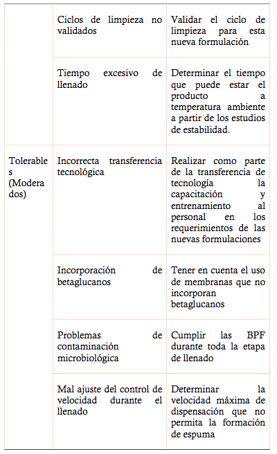 No menos importante, es el riesgo clasificado como alto e inaceptable, detectado en la etapa de llenado, que se corresponde con el tiempo excesivo de llenado. Esto puede afectar la estabilidad del producto, la esterilidad del mismo o del área de formulación por la excesiva manipulación. La esterilidad es un atributo principal para garantizar la seguridad de un producto inyectable, para lograr esta condición es necesario cumplir con requisitos especiales, con vistas a minimizar los riesgos de contaminación microbiológica; la presencia de partículas subvisibles y de endotoxinas bacterianas (Hussong, 2010).