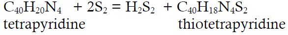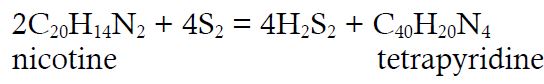In 1893 Cahours and Étard reported on the action of sulfur on nicotine (Cahours, and Étard, 1879). Heating gradually a mixture of 100 parts of nicotine and 20 of sulfur to 140 .C and more resulted in the release of large amounts of hydrogen sulfide, showing that sulfur had dehydrogenated nicotine. When the temperature reached 160.-170 .C the mass became fluid and assumed a chrome green color. Upon cooling and left to itself for several days, the mixture deposited a large amount of prismatic sulfur yellow crystals, several millimeters long. These crystals were separated by expression, purified by dissolution in an acid, reprecipitated and crystallized from boiling alcohol, and decolorized with carbon black. The purified yellow crystals were sparingly soluble in cold alcohol, benzene, and ether, insoluble in water, and showed no action on litmus paper. They melted at 155 .C and on cooling became a yellow resinous mass. Upon distillation they decomposed releasing hydrogen sulfide. Elemental analysis indicated that their composition corresponded to the formula C40.18N.S.. Cahours and Étard named the new compound tetrapyridineand reported its reaction with a variety of reagents such as HCl, sulfuric acid, alkalis, platinum dichloride, mercuric chloride, picric acid, gold chloride, and potassium dichromate. All these results suggested that nicotine could be considered a combination of bipyridine and hydrogen, and that the reaction of sulfur with two molecules of nicotine transformed the latter into tetrapyridine and thiotetrapyridine, as per the following reactions: