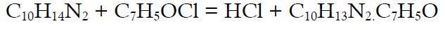 Étard wrote that in his previous publication he had remarked that most chemists considered nicotine as a base having two tertiary nitrogen atoms -N= (Étard, 1893c). Their best proof of this assumption was that nicotine did not react with acid chlorides, such as benzoyl chloride, to yield benzoylnicotine accompanied by release of HCl. A result of this nature would contradict Étard's previous claim that nicotine actually contained a secondary nitrogen atom - NH- and a tertiary one (Étard, 1883). Hans Will had already reported that benzoyl chloride gave with nicotine a compound of simple addition having the formula C10.14N..2C.H.OCl (Will, 1861). Étard did not check this finding but wrote that he had already observed that nicotine formed with benzoyl chloride a benzoic derivative. He now reacted 16 g f dry nicotine with an excess of freshly distilled benzoyl chloride and noticed that no reaction occurred at room temperature. Heating to the boiling point of the chloride produced a live reaction with abundant release of HCl, according to the following equation