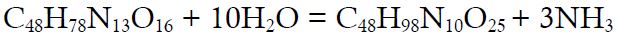 Étard chose another road for disintegrating albumins: decomposition of the albumins and glycoproteins by means of sulfuric acid. Boiling 1 kg of dry supraspinatus muscle of beef with sulfuric acid of 20%, he obtained about 1.65 kg of sugar semi-cristalloid matter (like honey), colorless and highly sweet. From an aqueous solution of this material he was able to separate albumin, having composition by weight, 52.8% carbon, 7.1% hydrogen. 16.5% nitrogen, and 23.6% oxygen, and leucine of composition 54.9% carbon, 9.9% hydrogen. 10.7% nitrogen, and 24.5% oxygen. This first result indicated that the tissue fiber, represented by C48.78.13.16, fixed 10 moles of water losing only ammonia, as per the following equation (Étard, 1900):