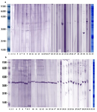 La inmunorreactividad a las proteínas del extracto de semillas de soya se estudió en el suero de 30 pacientes (5 niños, 25 adultos). En la Fig. I se muestran los resultados de este ensayo empleando la técnica de Western Blotting. Como se puede observar la banda cercana a los 34 kDa fue la más representada, siendo reconocida por la IgE de 23 sueros de pacientes (4 niños y 19 adultos) para un 76,6% de reconocimiento. Además, fue reconocida por la IgG4 de todos los sueros analizados.