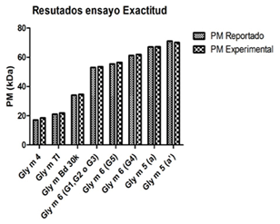 La exactitud del método fue demostrada, pues, como se observa en la figura II, no hubo diferencias significativas (t Student, p>0.05) entre los pesos moleculares determinados por la técnica de SDS-PAGE con las condiciones establecidas y los valores de referencia reportados en la literatura.