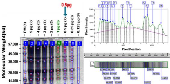 El sistema consta de una cámara de electroforesis acoplada a una fuente de corriente alterna. La técnica se realizó teniendo en cuenta que para la preparación de las muestras al extracto liofilizado se le realizó una dilución 1/8 y al glicerinado una dilución 1/4 en H2O destilada. A partir de estas diluciones se tomaron 20 µL, se le adicionó igual cantidad de tampón reductor, se calentaron 5 minutos y se aplicaron posteriormente 10 µL. Se utilizó un Patrón de Bajo Peso Molecular de 14-97 kDa (Pharmacia). La corrida del gel se realizó bajo las condiciones: 25 mA de corriente y voltaje abierto. Una vez terminada la corrida, se tiñó 1 hora en la zaranda a temperatura ambiente y destiñó cambiando la solución de destinción 2 ó 3 veces para lograr una completa visualización de las bandas. Se realizó el análisis densitométrico mediante el sistema ImageMaster v4.0 (Amersham Pharmacia) y se determinaron el PM de las bandas detectadas y el área bajo la curva expresada en porcentaje del total (A%) de las bandas contenidas en los rangos seleccionados.