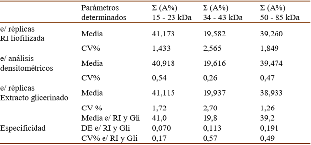 Para evaluar la repetibilidad de la técnica, fue realizado por un mismo analista un ensayo (como se describe en el acápite 2.2) para cada muestra aplicando 6 réplicas en cada caso. El análisis densitométrico del gel correspondiente a la RI se realizó por triplicado. Se determinaron, mediante una hoja de cálculo de Excel, la media de la suma de los valores de PM y de A%, de las bandas contenidas en los rangos seleccionados y la desviación estándar (DE) y coeficiente de variación (CV%) de la suma de los valores de A%. Se tuvieron como criterios de aceptación: que el CV% de A% entre réplicas de un mismo ensayo y entre diferentes análisis densitométricos fueran menor que el 5%, para cada suma.