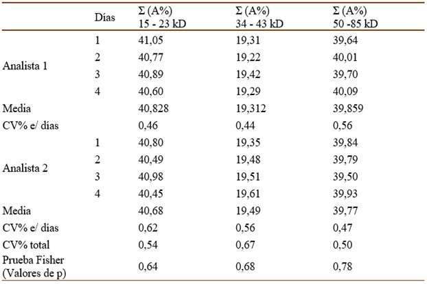 En el caso de la precisión intermedia, como se observa en la tabla II, los CV% calculados en cada caso fueron menores que el 5% y se demostró a través de la prueba de Fisher la no existencia de diferencias significativas entre los CV% de los analistas, pues los valores de p fueron mayores que 0,05. De esta forma se cumplieron los criterios de aceptación del ensayo y quedó demostrada la precisión interensayo de la técnica de SDS-PAGE para las muestras analizadas.