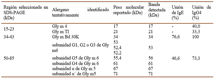 En este trabajo, también fueron reconocidas por la IgE del suero de pacientes bandas entre 50-85 kDa (46,6 %), pero con menor intensidad que la banda de 34 kDa. Este conjunto de bandas apretadas podrían corresponder a subunidades de Gly m 5 (b-conglicinina) y Gly m 6 (glicinina), dos proteínas de almacenamiento que componen la mayor parte del contenido proteico de la soya, las cuales son reconocidas como los alergenos más importantes y clínicamente relevantes de las soya en países desarrollados (Murakami et al., 2018).