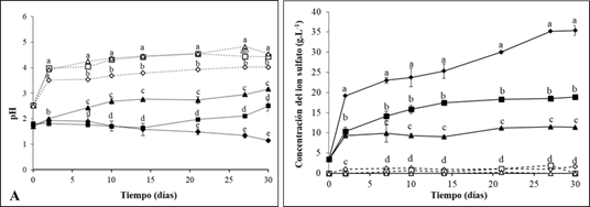 En todos los tratamientos inoculados con la bacteria se detectó sulfato en el medio. La concentración de este ion (Figura 1B) fue mayor en los cultivos con 5% (p/v) de mineral, la que superó dos veces la concentración detectada en los cultivos con 10 y 20 % (p/v). A partir de los 21 días de incorporar el escombro a los cultivos, en los medios con mayor densidad de pulpa, la concentración de sulfato se mantuvo constante. En los controles abióticos la concentración de sulfato en el medio no fue significativa.