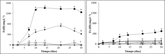 En todos los tratamientos se detectó en el medio Fe (II). La concentración de este ion (Figura 2A) superó en más de dos veces la concentración de hierro férrico (Figura 2B) en los medios con 5 y 10% (p/v) de mineral. En sistemas con 20% (p/v) del mineral, las concentraciones de hierro ferroso y férrico no fueron apreciables. La mayor concentración de hierro ferroso se detectó en el medio con 10% (p/v) de densidad de pulpa. La concentración de hierro ferroso registrada en los cultivos con 5% y 10% (p/v) fue significativamente superior a la registrada en los respectivos controles abióticos, lo que indica que A. thiooxidans bioacelera la disolución reductiva del hierro férrico contenido en los minerales lateríticos.