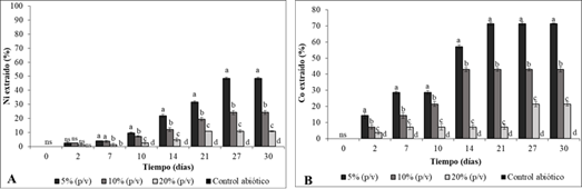 Los resultados de la evaluación del bioácido en la solubilización de níquel y cobalto a partir de los minerales en estudio empleando 10% (p/v) de densidad de pulpa se presentan en la figura 4. El recobrado de los metales aumentó en el tiempo. En los controles abióticos no se detectó los metales evaluados en solución. Los porcentajes de extracción de Co (II) fueron significativamente superiores a los de Ni (II). A los 14 días se logró extraer la mayor concentración de cobalto (31,5%), mientras que la concentración de níquel se mantuvo constante en el medio a partir del cuarto día, obteniéndose 2% de solubilización de este metal.