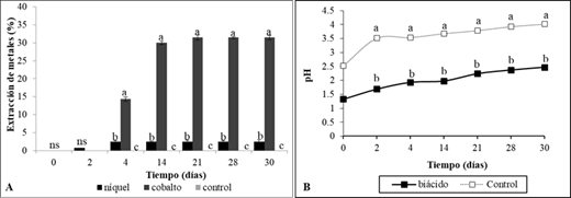 El pH del medio aumentó en el tiempo, tanto en los medios con el bioácido como en los controles abióticos (Figura 4B), al concluir el experimento el pH del sistema con el bioácido fue de 2,47 mientras que el del control abiótico fue 4,02. A pesar de que estos resultados indican que el bioácido bacteriano permite la solubilización de Ni y Co, los porcentajes de solubilización estos fueron ocho y dos veces superiores, respectivamente, en presencia de la bacteria.