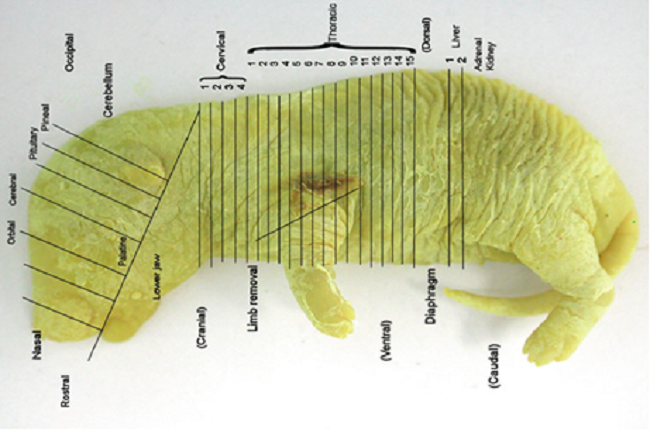 El examen de las anormalidades esqueléticas y viscerales en los fetos facilita la detección de cambios relacionados con la administración de compuestos químicos. Entre los diversos métodos de laboratorio a los que se recurre para este fin, se encuentran dos de amplia aceptación y uso: la transparentación de tejidos y posterior tinción con rojo de alizarina para el examen esquelético (también denominada diafanización) y el tratamiento con solución de Bouin para la observación visceral (Hofmann et al., 2016).