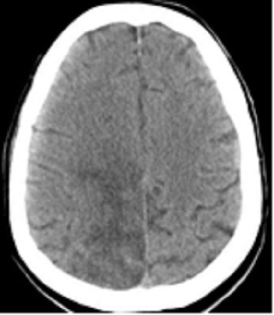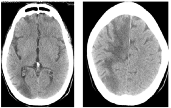 The simple computed axial tomography showed hypodense lesions in the frontal-parietal and right paramedian region without midline displacement (Fig. 1), the Electrocardiogram and Echocardiogram were normal. Due to the presence of a high fever and a probable infectious neurological syndrome, it was decided to start treatment with Cefepime (2 g) every 12 hours x 10 days.