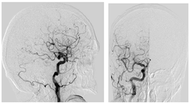 The digital subtraction arteriography showed a fine-tuned right internal carotid artery with absence of normal vascularization in the anterior cerebral artery and middle cerebral artery terminal branches, normal remainder (Fig. 3 and Fig. 4).