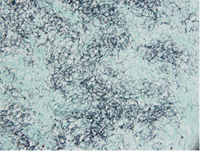The histopathological study of brain tissue obtained by stereotaxic biopsy with Hematoxylin-Eosin stains, acute inflammatory infiltrate based on polymorphonuclear and neutrophils was observed and with the silver methylamine technique evidenced the presence of clustered filamentous bacteria, compatible with infection by Nocardia (Fig. 5 and Fig. 6).