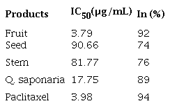 The extracts evaluated markedly inhibited the cellular proliferation at very low concentrations. The IC-50 values of each product for cell line PC 3 are shown in Table 1. The IC50 value for fruit extract was below IC50 value of Paclitaxel drug. On the other hand, Paclitaxel and fruit extract were able to inhibit the 50 % cell growth, at very low concentration.