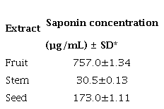 Table 2 summarizes the concentrations of saponins present in the three extracts determined by interpolation in Q. saponaria M. curve (y=0.371x-0.44; r= 0.9388). As can be seen, the concentration of saponins from fruit extract is higher than from seed and stem extracts.