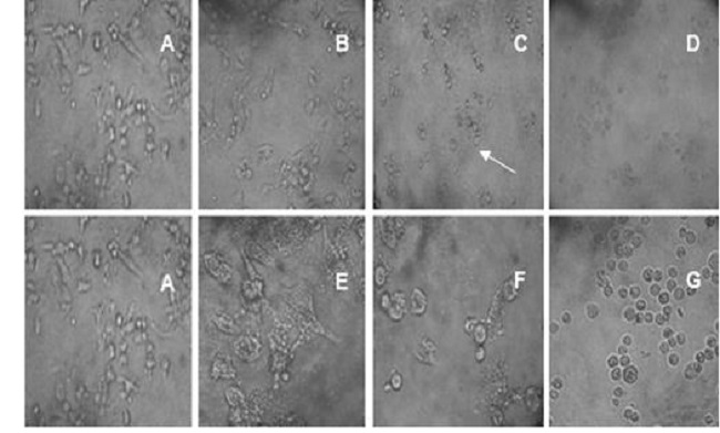 The morphological changes observed in PC3 tumor cell line due to the antiproliferative effect of the extract of fruit was showed in Figure 1. Untreated cells taken as a negative control formed a homogenous monolayer of characteristic morphology (Figure 1 A). Figure 1 B shows that at low concentrations of the extract, the cells changed their typical morphology. Furthermore, they showed unmistakable irregularities at cell borders, cell elongation and rupture of cell membrane. The effects of highest concentrations of the fruit extract applied are shown in Figure 1C and D, where the destruction of a part of the cell monolayer can be seen at 10 mg/mL of fruit extract, with the formation of vacuoles by binding the contents of multiple cells. In figure 1 E, F and G the effect of antineoplastic Paclitaxel, used as positive control in the antiproliferative assay is showed. Low concentrations of the control drug inhibit the formation of monolayer and change the morphology of the individual cells towards rounded and separated cells with abundant vacuoles and irregular borders.
