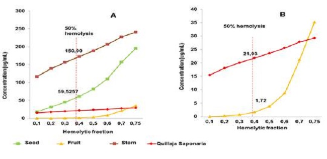 A standardized concentration curve of a reference saponins Quillaja saponaria Molina (0.5 µg/mL) was applied against hemolyzed extract fractions in which the values of the extracts were interpolated to obtain their concentration of saponins.