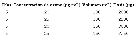 A cada paciente se le aplicó ozonoterapia por insuflación rectal, colocándolo en decúbito lateral, administrándole el ozono mediante una sonda rectal plástica de 30 cm de largo, previamente lubricada y colocada por vía anal e introduciéndola de 10-15 cm. Para trabajar con el gas se utilizaron jeringuillas de 50ml. El O3 fue introducido lentamente, después la sonda se pinzaba para posteriormente retirarla despacio. El paciente debía retener el gas durante 30 minutos después de su aplicación y no debía: ingerir líquidos y alimentos, agacharse, orinar, defecar, toser y subir escaleras hasta un 1er piso, por igual intervalo de tiempo. Se emplearon dosis escalonadas progresivas que aumentaban cada 5 días,1 sesión diaria de lunes a viernes, durante 20 sesiones. (Tabla No.1.)