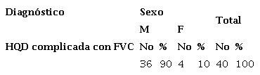 En la tabla No 2. se refleja la distribución de los pacientes afectados por herida quirúrgica abdominal dehiscente (HQD) complicada con fístula vesicocutánea (FVC) según sexo: el 90 % masculino y el 10 % femenino. Los resultados están en correspondencia con las características demográficas de los pacientes que acuden al servicio de Urología a operarse, donde predominan los hombres. El comportamiento de esta situación es similar a la reportada en otros países debido a que casi todos los casos de fístulas vesicocutáneas adquiridos aparecen: