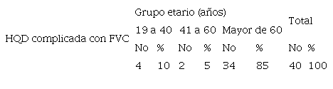 En la tabla No. 3 se representa la relación existente entre la HQD complicada con FVC y los diferentes grupos etarios en estudio. El grupo menos afectado es el que incluye a los pacientes de 41-60 años que representó un 5 % y el más afectado el grupo etario que comprende las personas mayores de 60 años con el 85 % del total de los pacientes.