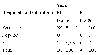 No existen diferencias estadísticamente significativas entre la respuesta al tratamiento y el sexo (p=0,7>0,05), aplicándose la prueba estadística Chi cuadrado con un nivel de significación α=0,05. En cualquiera de los sexos la respuesta excelente al tratamiento fue altamente significativa.