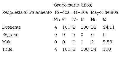 El grupo etario con una mejor respuesta al tratamiento fue el de los pacientes con edades comprendidas entre los 19 y los 40 años y entre 41 y 60 años, donde los investigadores comprobaron, al examinar a los pacientes, la cicatrización adecuada y estética de la herida quirúrgica abdominal dehiscente y el cierre de la fístula vesicocutánea en el 100% de sus integrantes. El grupo de peor respuesta al tratamiento fue el de los pacientes mayores de 60 años, donde el 94,11 % presentó una respuesta catalogada como de excelente al concluir el tratamiento con ozono y el 5,88% fue mala.