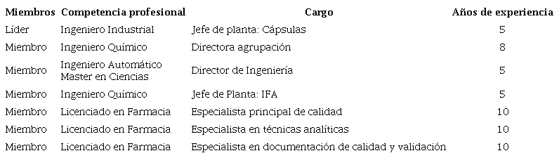 Se conformó un equipo con siete integrantes, teniendo en cuenta el grado de conocimiento, la experiencia práctica en el entorno de fabricaciones de ingrediente farmacéutico activo (IFA) y cápsulas blandas, la creatividad, la posibilidad de participación, la capacidad de resolución de problemas o flexibilidad, nivel de respuesta rápida a la solución del problema, comportamiento grupal, capacidad de orientación y respuesta lógica.
