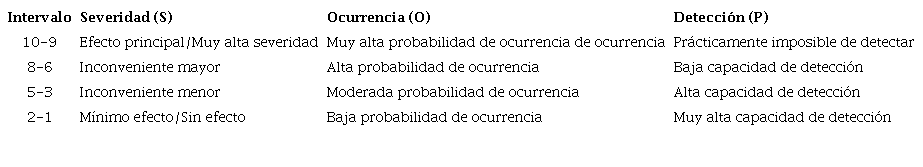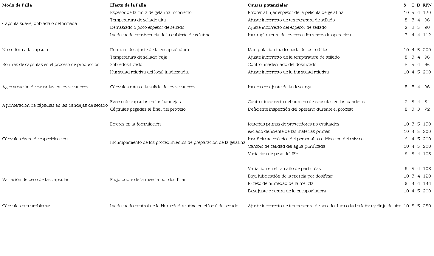 La aplicación del método comenzó con el análisis del tipo y probabilidad de ocurrencia de las fallas en el proceso de producción de cápsulas blandas de gelatina, la evaluación del impacto en la calidad del mismo y la probabilidad de detección de dichas fallas. Se empleó una escala de 10 puntos para la severidad (S), la probabilidad de ocurrencia (O) y la probabilidad de detección (P), con el objetivo de determinar el número de probabilidad de riesgo (NPR) (ICH Q10, 2008).