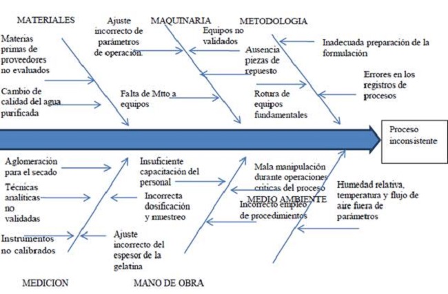 Como se aprecia en la tabla 3, son cinco las causas potenciales que tienen mayor influencia en las fallas de un proceso de producción de cápsulas blandas: