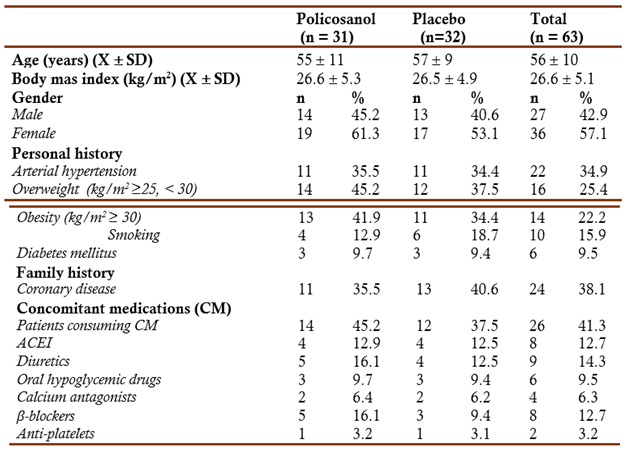Exclusion criteria: Patients were excluded if active renal disease, history of liver failure, diagnosed neoplasms, alcoholism, chronic decompensated diseases. Patients who had episodes of unstable angina, myocardial infarction, stroke or any serious adverse events within the three months previous to being enrolled in the study were also excluded. In addition, also were excluded patients consuming policosanol or other lipid-lowering medications in a period of three months prior to the study, medical history of allergy to medications, or with any other special condition that at the doctor's discretion puts your health and health at risk life during the study.