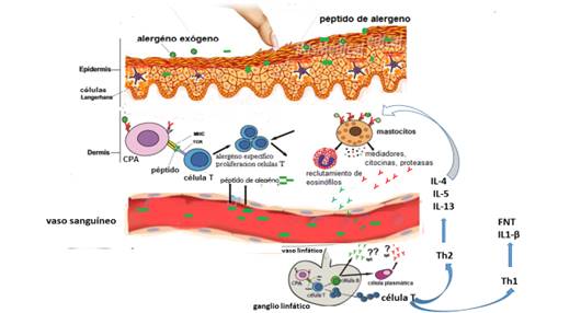 La exposición epicutánea a un alérgeno patógeno provoca el incremento de las respuestas alérgicas y sirve como factor predisponente para una marcha alérgica más severa. Ello condiciona el inicio de las respuestas inflamatorias relacionadas con la sobreexpresión de varios tipos de células dendríticas (CD) que expresan FcεRI (receptor IgE de alta afinidad) (Dubrac et al, 2010; Novak et al, 2010). Éstas migran a los ganglios linfáticos de drenaje donde procesan y presentan los péptidos a los linfocitos T vírgenes CD4+. La presentación de antígenos (péptidos) a los linfocitos T específicos es mediante el complejo mayor de histocompatibilidad (MHC) de clase II de las células T CD4. Los linfocitos T, se diferencian entonces en linfocitos Th2. La activación de linfocitos T cooperadores (Th2) propicia la producción de interleucina (IL)-4, IL-5 e IL-13, el incremento de la inmunoglobulina E (IgE), la unión del anticuerpo a receptores por la región Fc de los mastocitos y la activación de los mastocitos por la reexposición al antígeno, dando lugar a la liberación de mediadores de mastocitos (aminas y enzimas preformadas) Figura 1. Las citocinas liberadas por las células T activadas y los mastocitos atraen a los granulocitos, especialmente eosinófilos en la piel que contribuyen al daño celular. El contacto constante con alérgenos a través de la piel (contacto epicutáneo) puede inducir la activación sistémica de las células T específicas de alérgenos. A su vez, estos mecanismos inmunológicos de fase aguda mediados por la respuesta Th2, pueden persistir debido a la liberación de mediadores inflamatorios, que, al mismo tiempo, activan el endotelio vascular para inducir la expresión de moléculas de adhesión e incrementar la permeabilidad vascular. Por otro lado, en fase de cronicidad de la enfermedad se activa la respuesta Th1 que genera interleucina 1 beta (IL-1β) y factor de necrosis tumoral alfa (siglas en inglés, TNF-α), lo cual magnifica la respuesta inmunitaria y la inflamación cutánea (Leung et al, 2003; Campana et al, 2017) Figura 1.