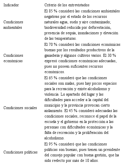 La triangulación de los métodos aplicados permite afirmar que en la comunidad estudiada la vulnerabilidad ambiental se expresa de manera más marcada ante la amenaza que constituye la sequía, debido a los altos niveles de deforestación, que han provocado la desaparición de especies vegetales, con la consiguiente disminución de precipitaciones y prolongación de los períodos secos. En períodos de lluvia se producen inundaciones de los ríos cercanos a la comunidad, que interrumpen el acceso al lugar.