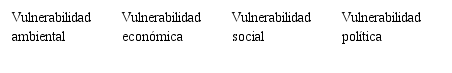 Según Wilches-Chaux (1989), la vulnerabilidad es la incapacidad de una comunidad para absorber los efectos de determinado cambio en el ambiente, su incapacidad para adaptarse al mismo. Es necesario precisar que la vulnerabilidad es un sistema dinámico que surge por la interacción de una serie de factores internos y externos, que únicamente se separa en diferentes vulnerabilidades para su estudio. Para el análisis de la vulnerabilidad en Monte Alto se trabajaron las siguientes dimensiones: condiciones ambientales, económicas, sociales y políticas, a partir de la aplicación de la matriz PEIR y de entrevistas realizadas a pobladores de Monte Alto. Los principales resultados se muestran en la tabla No.1.