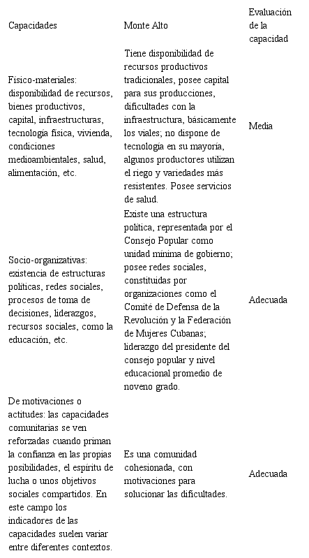 Esta comunidad posee capacidades que, bien aprovechadas, pueden ser utilizadas para reducir las vulnerabilidades y emprender acciones de adaptación. Para el análisis de las capacidades se consideró lo expresado por Zabala (2013), al exponer que estas pueden ser físico-materiales, socio-organizativas y de motivaciones o actitudes. Para efectuar la valoración de las mismas se manejaron las categorías adecuada, media e inexistente. Los resultados se muestran en la tabla No.3.