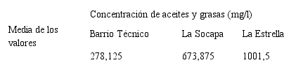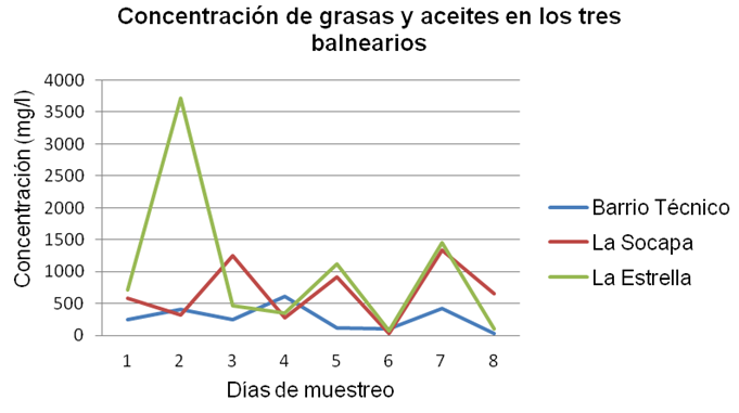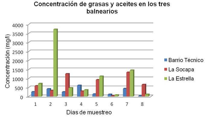La Estrella se presentó como más contaminado 4 de los 8 días de muestreo, y La Socapa y Barrio Técnico 2 de los 8 días de muestreo. Asimismo, los valores de concentración de grasas y aceites en Barrio Técnico no sobrepasaron los 1000 mg/l, en La Socapa se presentaron valores por encima de los 1300 mg/l y en La Estrella valores muy elevados, de 3720 mg/l, el mayor de toda la campaña de muestreo. De lo anterior se concluye que Barrio Técnico fue el balneario menos contaminado como promedio y La Estrella el más contaminado también como promedio.
