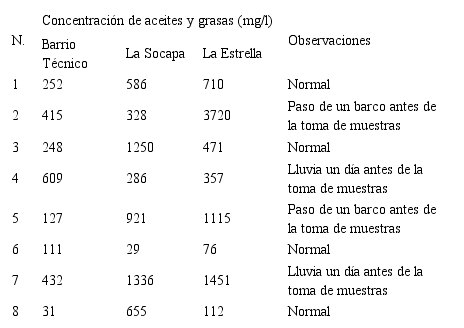 En la Tabla 1 se presentan los resultados de la determinación química de grasas y aceites en los tres balnearios muestreados. Se presentan, además, las observaciones realizadas por las autoras de este trabajo en el momento de la toma de las muestras, para señalar los factores externos que pudieron haber influido en los pronunciados cambios de concentraciones.