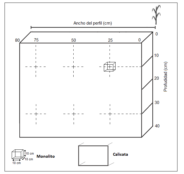 El método de muestreo utilizado para estimar la cantidad de raíces con exactitud (Bohm,1979) fue el monolito, con una dimensión de 10x10x10 cm para un volumen de 1 dm-3. Para ello se excavó una calicata de 80 cm de ancho por 45 cm de profundidad. A partir del centro de la cepa, se procedió a tomar tres puntos laterales (25, 50 y 75 cm), tomando la muestra a dos profundidades (0-20, 20-40 cm) en la intersección con la distancia lateral definida (Figura 1).
