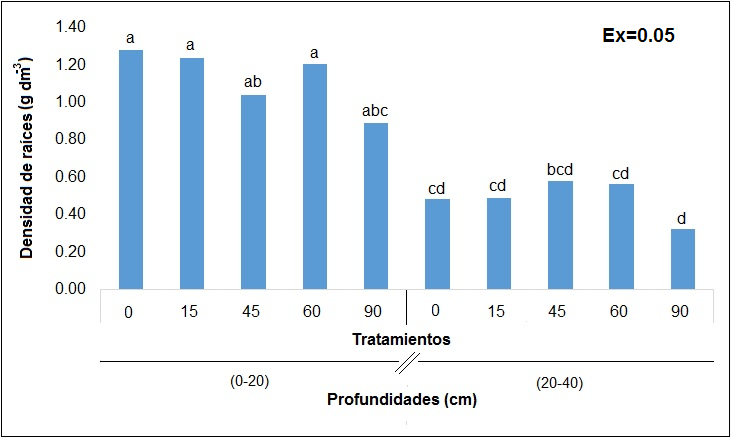 Se realizaron análisis de varianza de clasificación simple y doble. Y se procedió a la transformación de los datos de la densidad de raíces para cumplir con los requisitos de homogeneidad de varianza a través de la expresión: