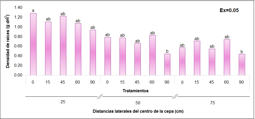 Al analizar el efecto del azufre en la densidad de raíces a las diferentes distancias del centro de la cepa, en el análisis de varianza (figura 3), se encontró que solo existió diferencia significativa en el tratamiento 0 a la distancia de 25 cm, respecto a la dosis de 90 kg ha-1 de S a los 50 y 75 cm del centro de la cepa. Se puede inferir que la mayor cantidad de raíces en valor se concentró en los 25 cm laterales del centro de la cepa.