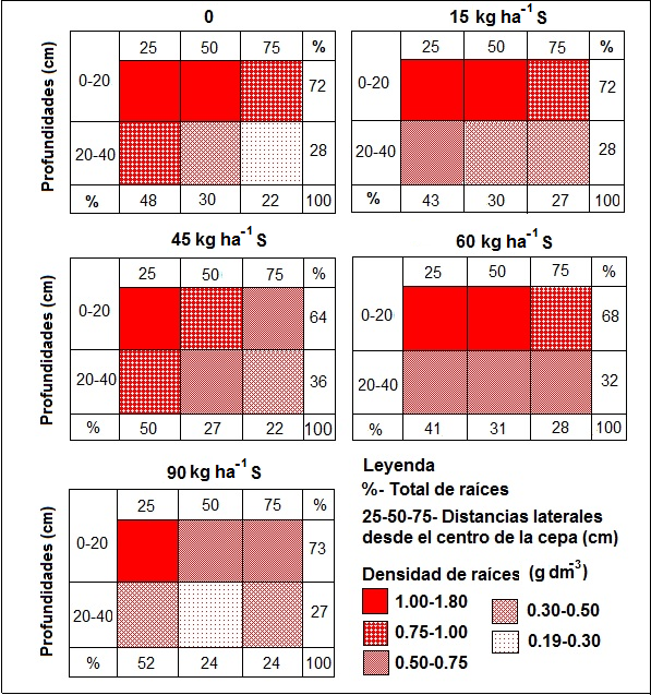 Obsérvese que todas las dosis en la profundidad 0-20 son significativamente superiores respecto a la dosis de 90 kg ha-1 de S a la profundidad de 20-40. Los tratamientos 0, 15 y 60 kg ha-1 de S, en la profundidad 0-20, son estadísticamente superiores respecto a las mismas dosis, pero en la profundidad 20-40. De forma general, la mayor concentración de raíces estuvo localizada en los primeros 20 cm de profundidad del suelo.